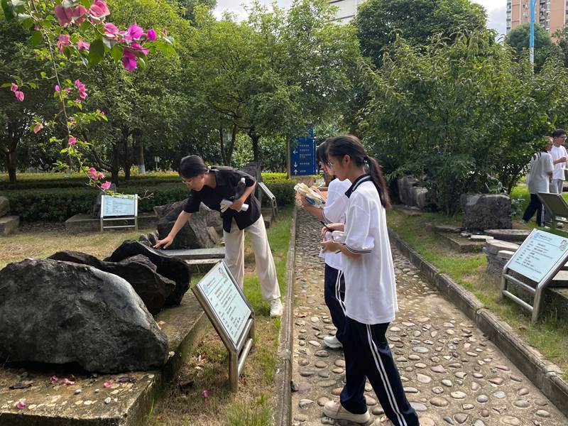 随后,师生们转战基地岩石园,开启地质科普之旅。各小组大学生化身“专业讲解员”,面朝岩石标本,向高中生生动解读三大岩的奥秘:从岩浆岩的气孔构造,到沉积岩的层理结构,再到变质岩的独特纹理,大学生们用通俗语言拆解专业概念,让抽象的地质知识变得可触可感。