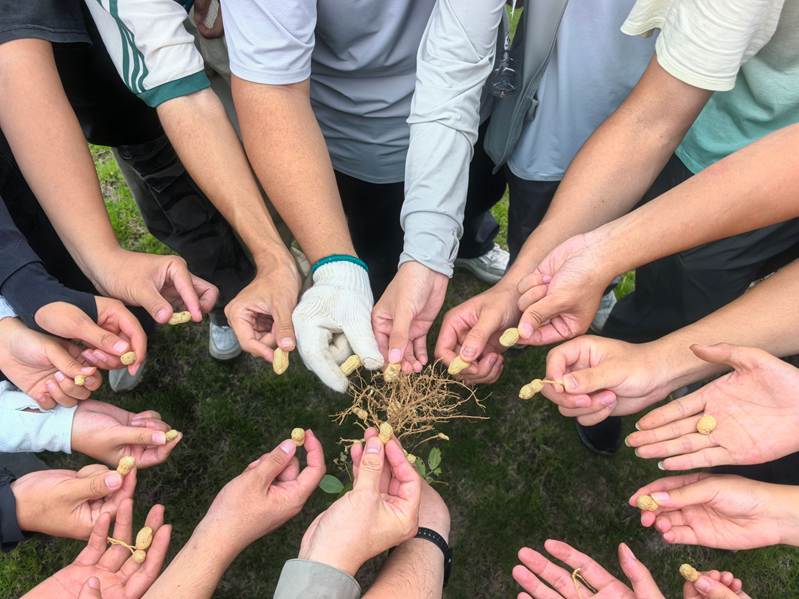 紧接着,活动进入劳动教育实际操作环节——花生采收。由基地负责绿化外围工作的员工担任劳动教师,现场示范安全采收规范:“握住花生植株基部,轻轻向上拔起,避免拉伤藤蔓;抖落泥土时要轻缓,防止花生果脱落。”讲解结束后,大学生带领高中生有序进入基地自种花生田,一起磨练采收技巧。