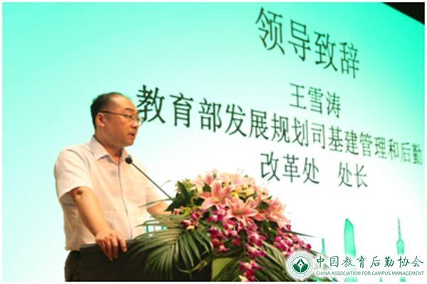 教育部发展规划司基建管理和后勤改革处处长王雪涛发表了重要讲话。他提出,党的十八届五中全会提出了“创新、绿色、共享、开放、协调”的五大发展理念,明确倡导全面节约和高效利用资源,要求强化约束性指标管理,开展能效、水效领跑者引领行动,强调实行最严格的水资源管理制度。今年6月,国务院召开的全国公共机构节约能源资源工作会议,明确提出了“十三五”时期公共机构节约能源的目标任务,实行能源和水资源总量和强度的双控,到2020年,人均能耗下降11%,单位建设面积能耗下降10%,人均用水量下降15%。
