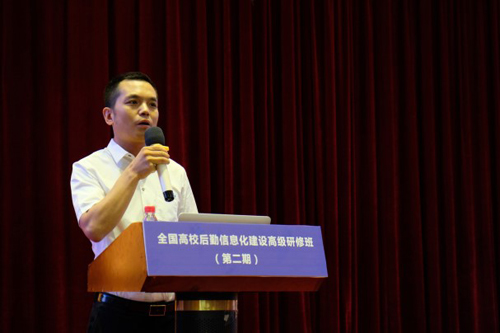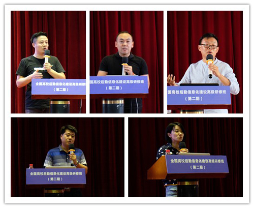 在经验交流环节,邀请了全国高校后勤信息化建设优秀单位的管理者及信息技术企业的高管分享经验。陕西师范大学校园信息化工程技术研究院产品负责人李含君以《移动互联时代高校智慧后勤建设实践与思考》为题作报告,总结了当前社会中信息技术发展带来的热点问题,介绍了陕师大后勤信息化20余年的建设思路及经验,将陕师大后勤信息化的系统架构、运营模式、丰富案例等与学员做了分享交流。西南石油大学后勤服务总公司校园管理中心副主任徐鹏飞作《基于互联网+高校后勤校园管理信息化服务平台的建立》报告,分享了西南石油大学信息化具体的建设经验,通过平台演示分享信息化管理流程,并将平台开发的创新思路与在座学员进行讨论。山西省实验中学副校长武志军作《学校智慧食堂建设的思考与实践》报告,其分享了建设模式、管理思路、数据分析及食品安全追溯流程等智慧食堂的建设经验,给各位学员在学校食堂管理方面提供了引导性的建设思路。杭州科技职业技术学院国有资产管理处副处长郑龙作《基于智慧校园的高校后勤信息化建设的融合创新》报告,他提出了杭科院利用信息化技术在推动后勤体制和机制创新层面的建设思路,并就校园O2O运营进行了实际案例分享,介绍了智慧校园建设的具体实施措施。