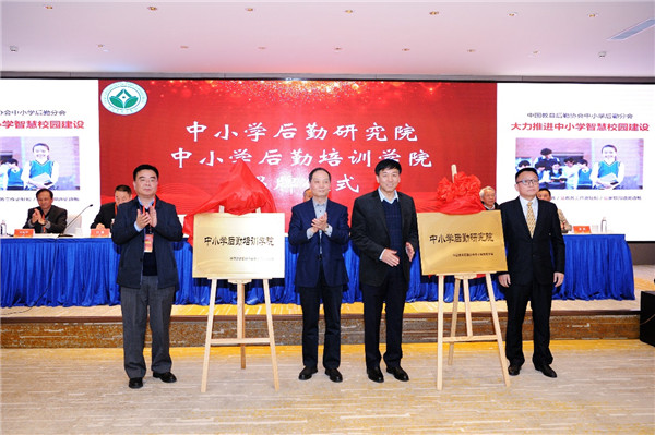 李有增理事长、中国教育企业股份有限公司陈云海董事长为中小学后勤研究院揭牌,张文忠名誉理事长、苏州市教育局华意刚副局长为中小学后勤学院培训学院揭牌
