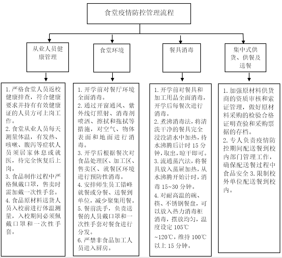 食堂是保障学校全体师生员工饮食安全的重要场所,疫情防控期间务必加强管理。严格执行国家市场监督管理总局《餐饮服务食品安全操作规范》要求,深入排查食品安全隐患,落实监管责任和主体责任。相关工作可参考食堂疫情防控管理流程图。