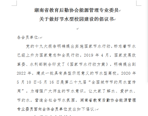 5月10日—16日,是全国第29届城市节约用水宣传周。为在我省校园积极开展好此项活动,配合做好创建国家节水型城市工作,让广大师生了解水、爱护水、节约水,增强节水意识,营造学校节水氛围,建设节水型校园、绿色校园,湖南省教育后勤协会能源管理专业委员会组织各会员展开了系列活动。