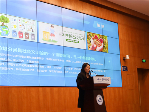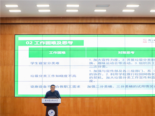 交流分享环节,杭州电子科技大学马超英就垃圾分类工作制度管理、宣传引领、活动培训、设备投放、实施举措等讲解了垃圾分类工作带来的新起点、新时尚、新挑战。浙江音乐学院金鑫从一个目标、三个突破、五项举措就进一步做好垃圾分类工作具体行动和方法进行了介绍,将垃圾分类融入艺术气息,用文艺创作助推垃圾分类。浙江水利水电大学陈俏伊从建制度、抓基础、转意识、树典型,再次强调了垃圾分类的重要性,以点带面、逐步开展,促进校园生态文明教育,让垃圾分类工作有章可行,有法可依。上海建桥学院杨真真从成立一个机构、聚焦两大任务、制定三个标准、组建四支队伍解读了上海市教委垃圾分类工作相关举措,并结合实际案例,就加强科学管理和强化组织领导、完善管理机制、开展宣传培训和推动爱粮节粮习惯养成、加强组织保障和志愿服务等方面分享了垃圾分类具体实施和方法,为浙江省高校垃圾分类工作推进提供了上海样本、建桥模式。